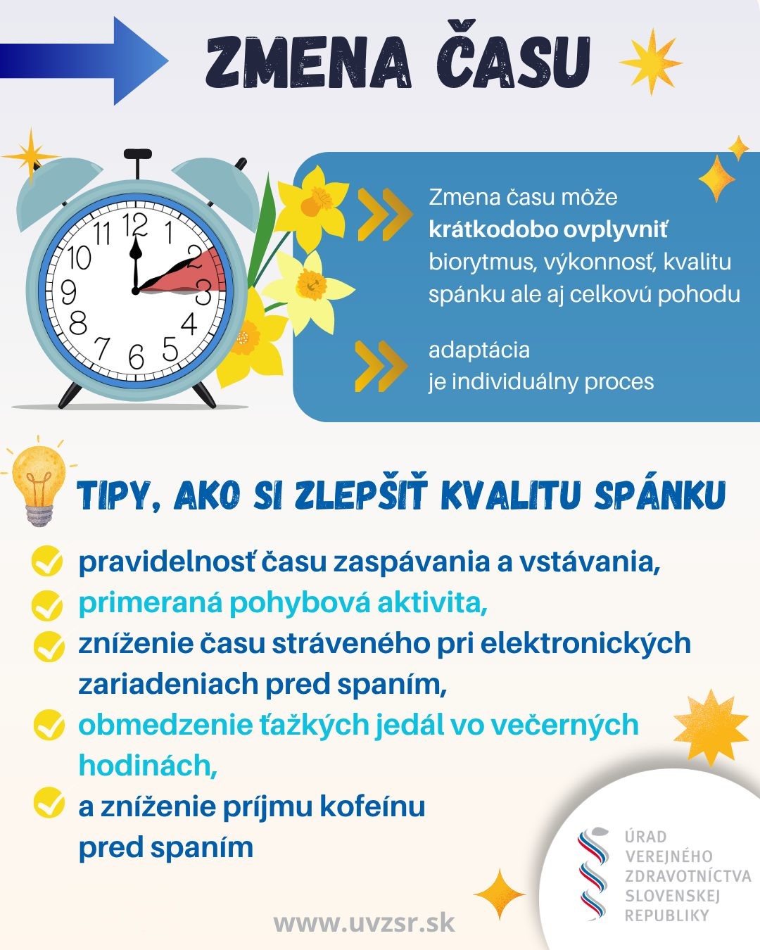 „U malých detí zmena času narúša ich denný a spánkový režim. Preto sa u detí odporúča posúvať režim (čas spánku, čas budenia, jedla) postupne o 10 – 15 minút a začať s prípravou niekoľko dní pred zmenou času. Aj s prípravou môžu byť deti unavenejšie, mrzutejšie a menej sústredené, ale to po niekoľkých dňoch ustúpi,“ dodáva vedúca Odboru hygieny detí a mládeže ÚVZ SR.
